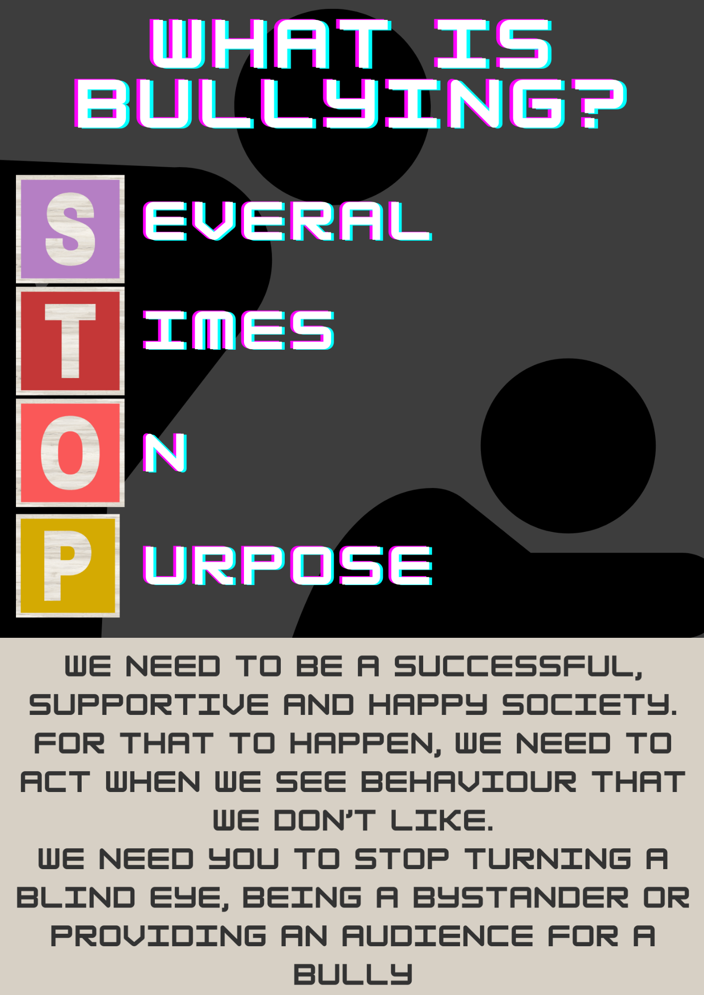 The STOP acronym for bullying stands for "Several Times on Purpose" and is used by schools to define bullying as an act of unkindness that is repeated and intentional. STOP helps us to define bullying, but it also encourages students to “Start Telling Other People” if they see or experience bullying.
